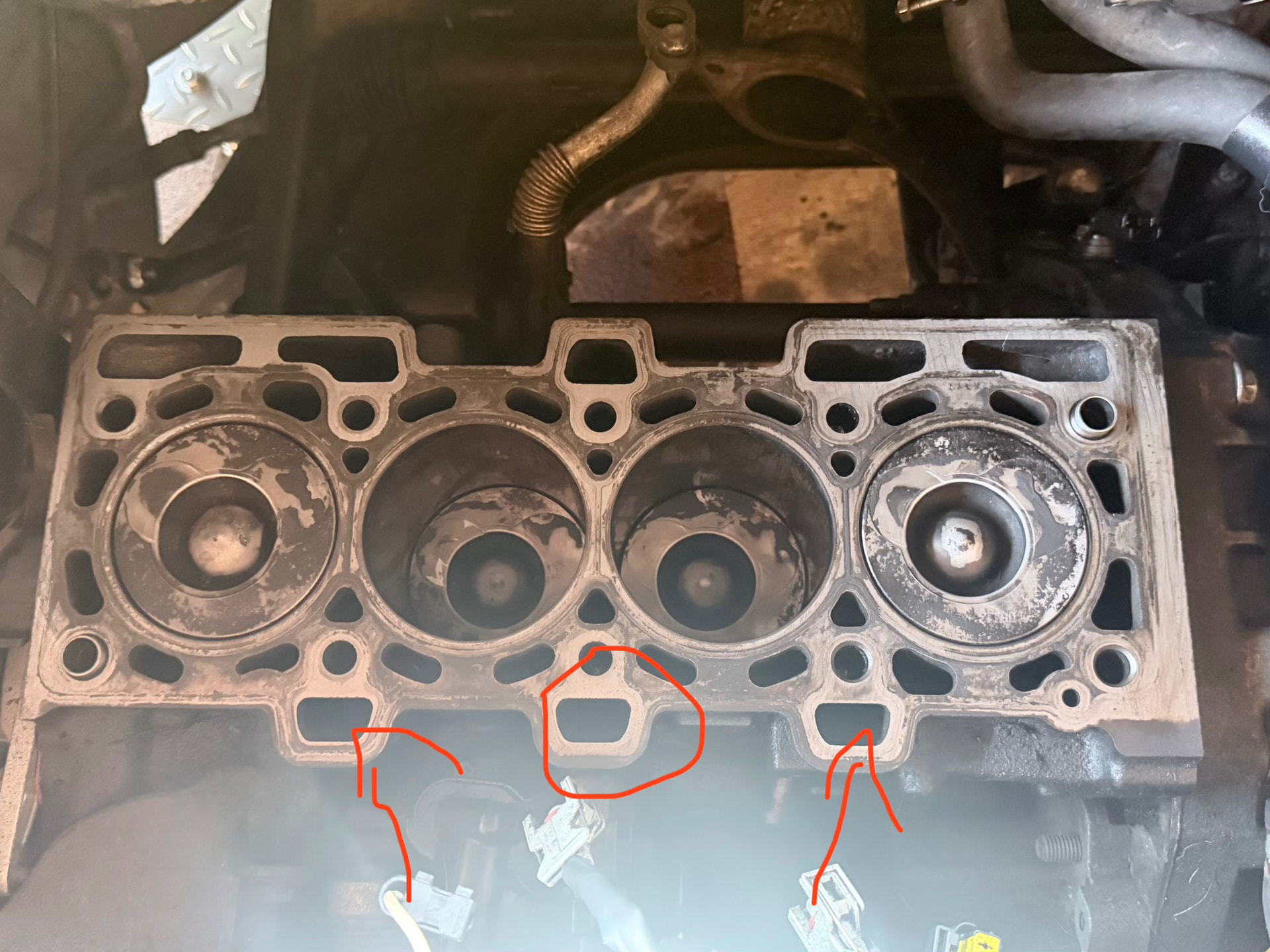 J’ai entouré du coup l’emplacement qui correspond au trou du joint de culasse et les flèches (trous bouchés par le joint).