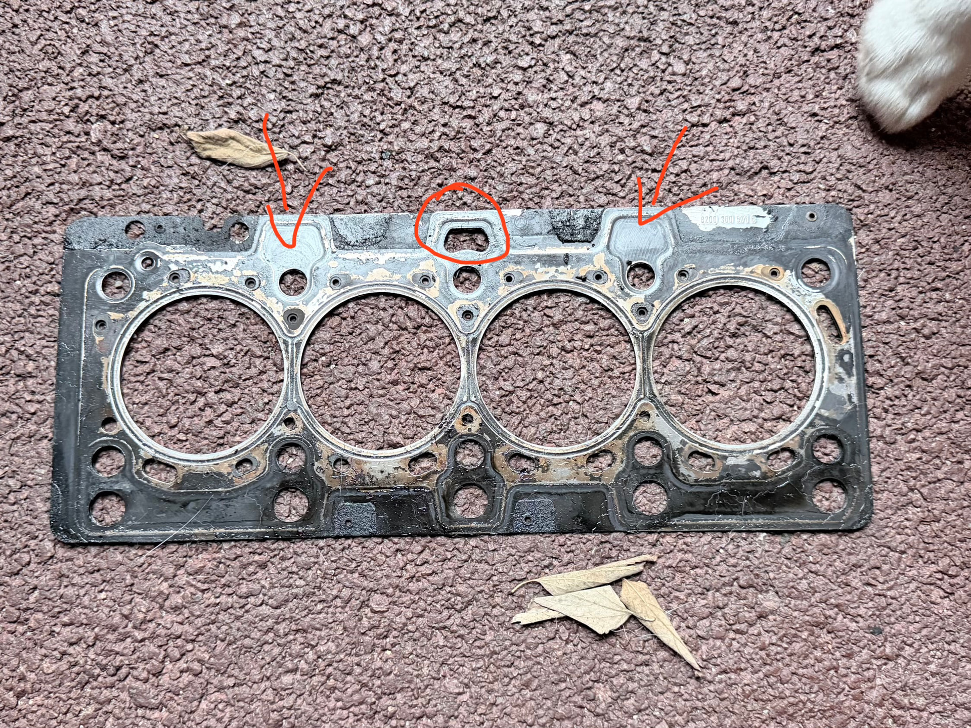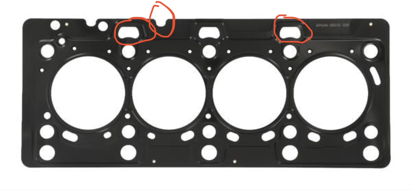 Je vais vous partager une photo de l’ancien joint de culasse et je vous montre qu’il y a un trou où j’ai entouré et au niveau des flèches, tous les nouveaux joints de culasse ont des trous aussi.