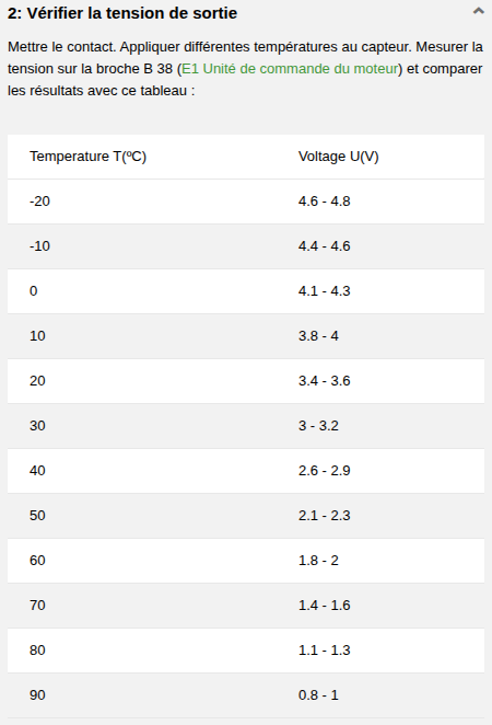 Le T1 c’est le capteur de liquide de refroidissement. Essaye de check s’il fonctionne via le multimètre… Pour ce capteur, voici les différentes étapes de mesures à faire :