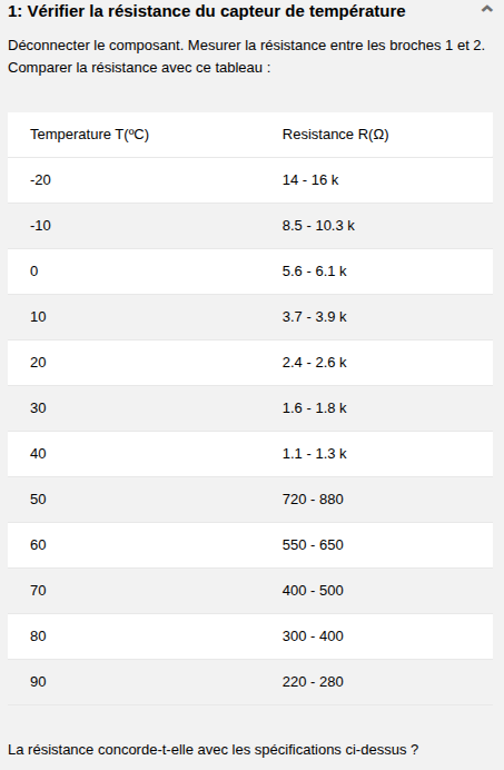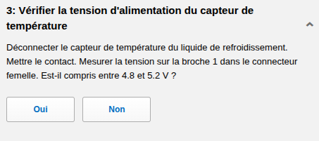 Pour l’étape 1 : Si les valeurs ne correspondent pas → changer le capteur de température du liquide de refroidissement il est HS. Si ça correspond, passer à l’étape 2.