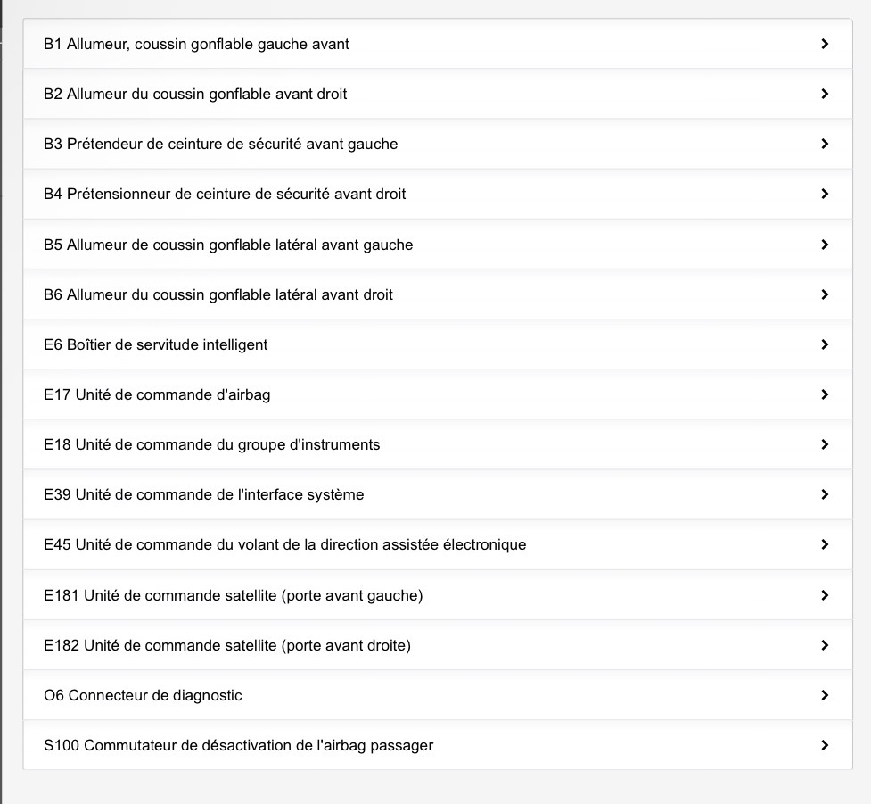 Le calculateur airbag est séparé et a sa propre communication. Normalement tu as le code + un petit descriptif et sans lettrage devant. Donc tout ce qui touche aux airbags ce sera des codes sans lettrage.
